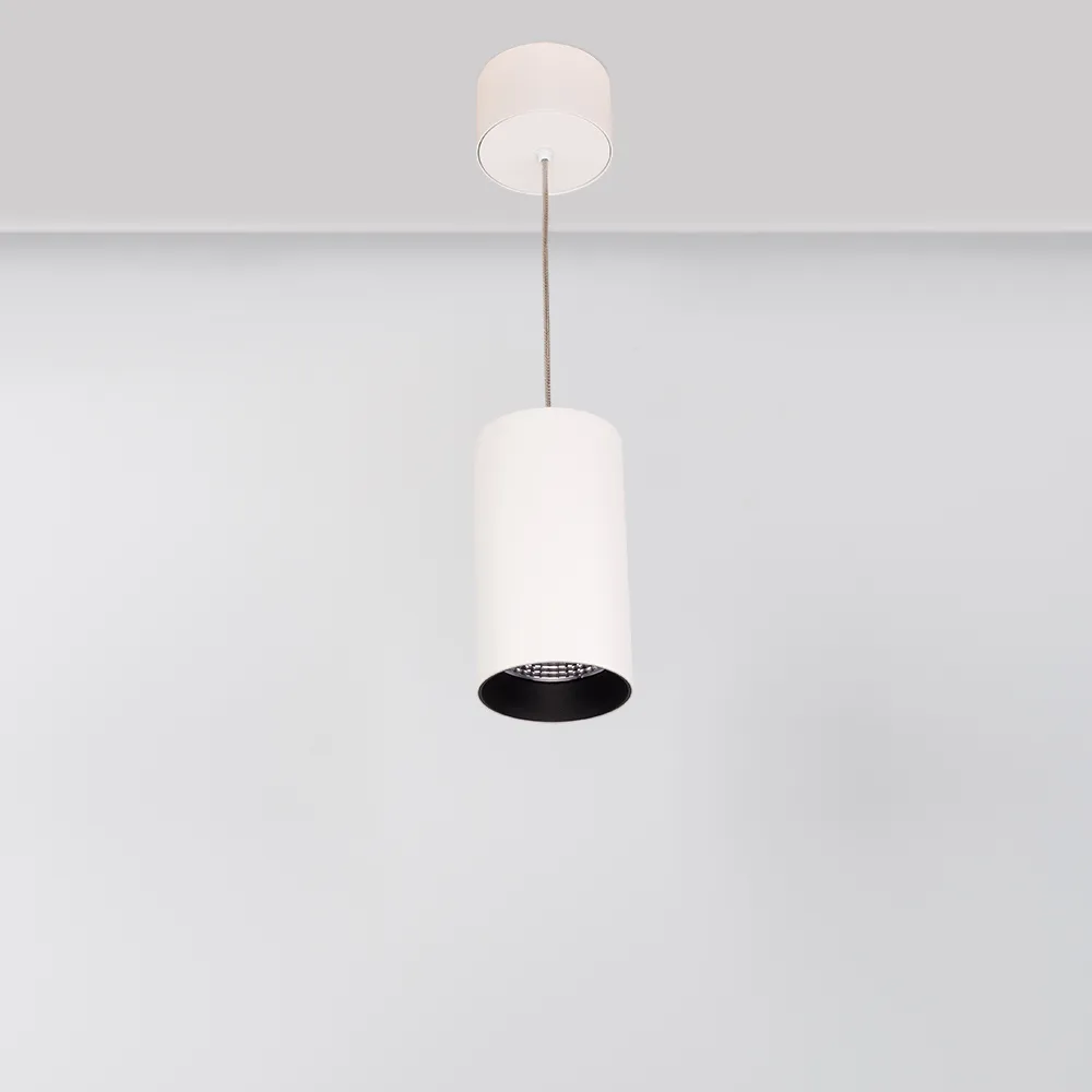 Подвесной светильник 15Вт, белый круглый корпус, черная вставка, металл. Цвет ДНЕВНОЙ БЕЛЫЙ 4000K, св.поток 1100лм, CRI(Ra)>80, угол 40°. Размер Ø85x155мм. Встроенный драйвер PRI:220-240VAC, SEC:DC 350mA 30-43V 15Вт.