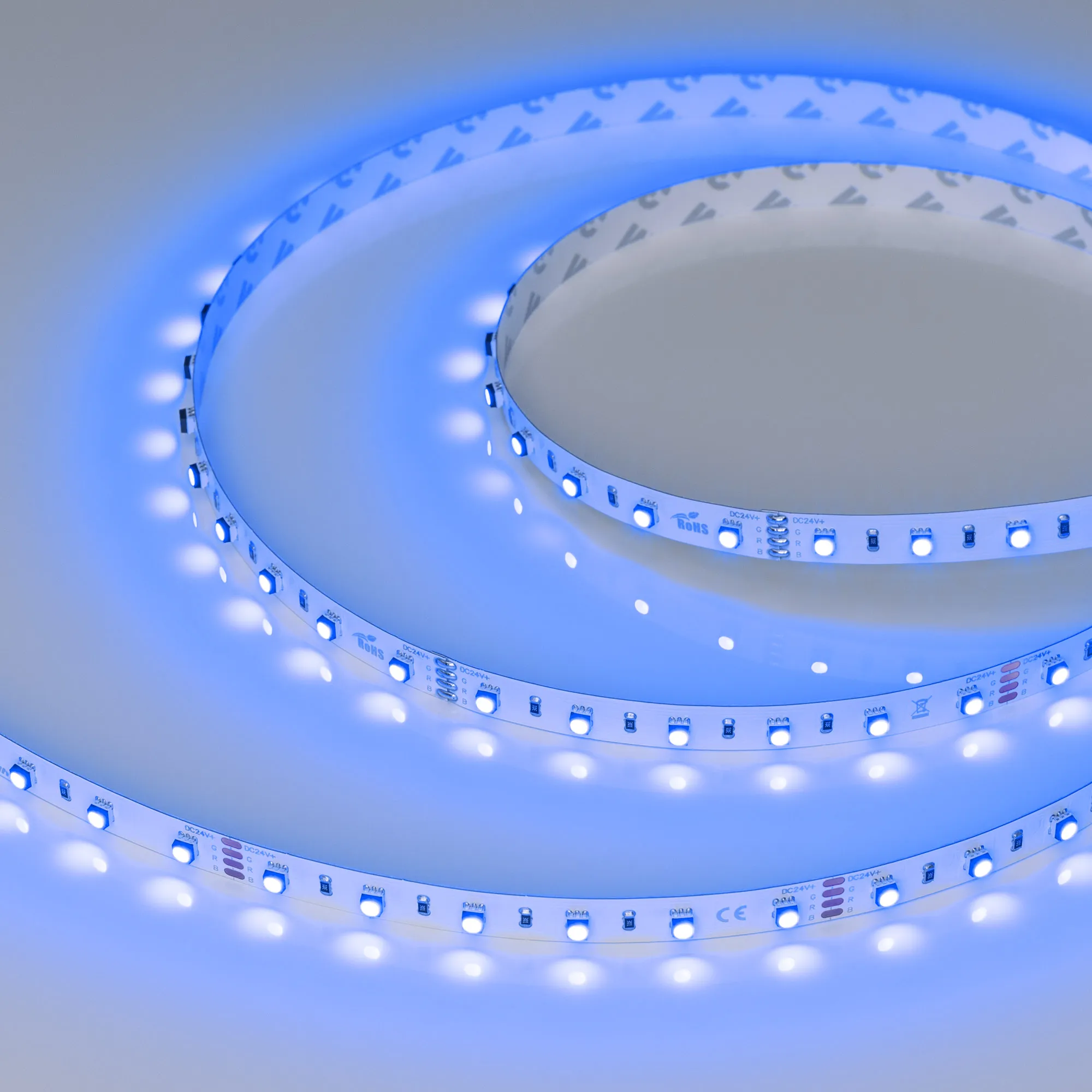 Мультицветная светодиодная лента MINI серии F60. Светодиоды SMD 3535, 60 шт/м, белая плата шириной 10 мм, скотч 3M. Цвет RGB, угол 120°. Питание 24 В, мощность 14.4 Вт/м (72 Вт на 5 м). Размеры 5000x10x3.1 мм. Мин. отрезок 100 мм, 6 светодиодов. Цена за 1 м.