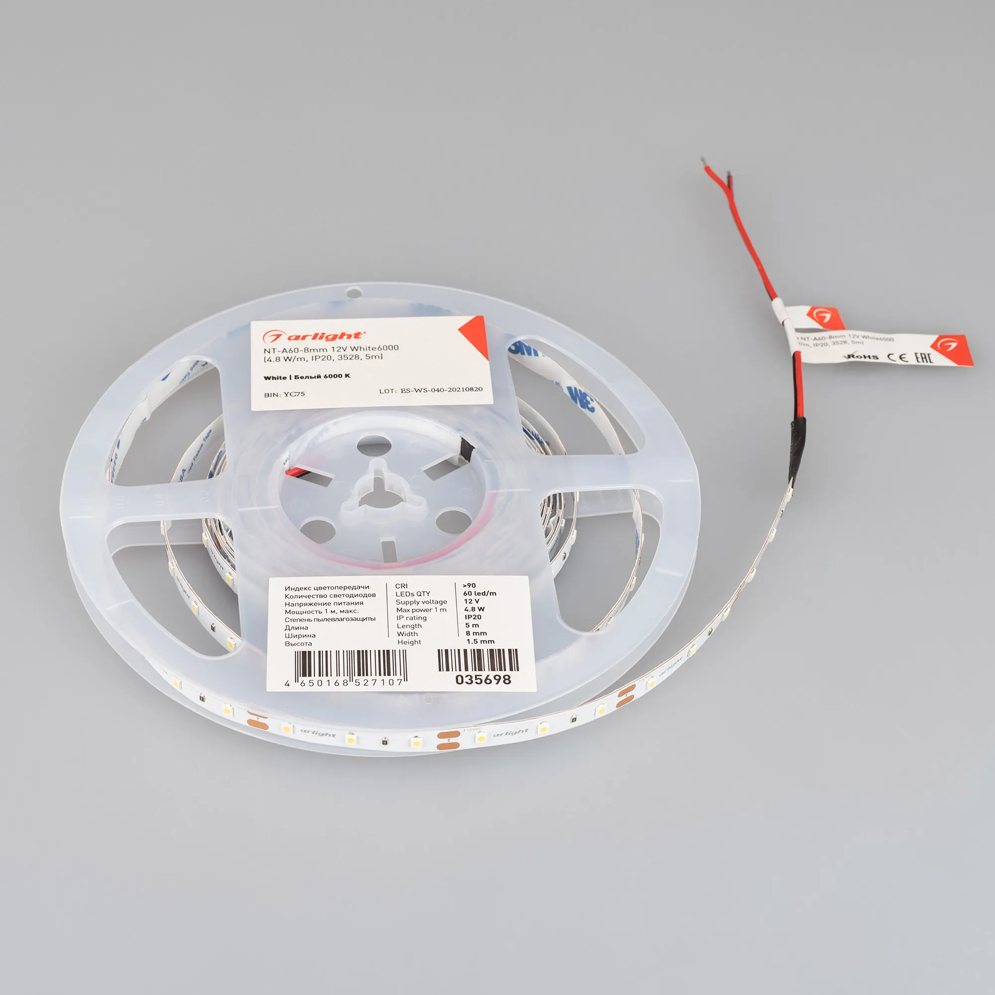 Лента светодиодная NT-A60-8mm 12V White6000 (4.8 W/m, IP20, 3528, 5m) (Arlight, Открытый)