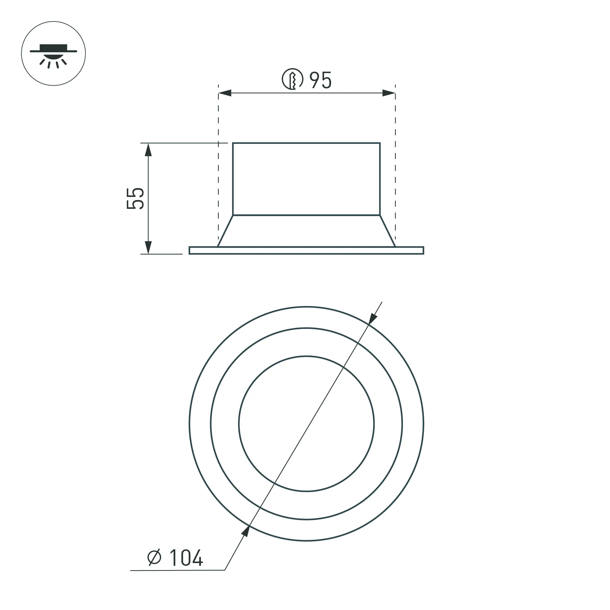 Встраиваемый светильник даунлайт. Мощность 12 Вт, св. поток 840 лм, 70 лм/Вт, тёплый 3000 K, CRI>90, угол 90°, напряжение питания 230 В. Белый круглый корпус из алюминия, степень защиты IP20. Размер: диаметр 104 мм, высота 55 мм. Монтаж встраиваемый, установочное отверстие: диаметр 95 мм. Драйвер 27-42 В, 300 мА, пульсация <2%.