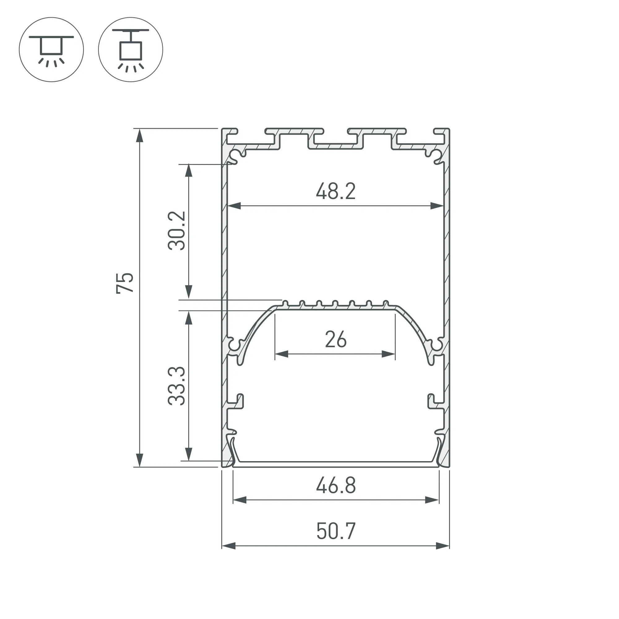 Алюминиевый профиль для светодиодных лент и линеек. Цвет - черный RAL9005 (порошковая окраска). Габаритные размеры (L×W×H): 3000x50,7x75 мм. Ширина площадки для ленты 26 мм. Отсек для БП 48,2х30,2 мм. Экраны, заглушки и другие аксессуары приобретаются отдельно. Цена за 1 метр.