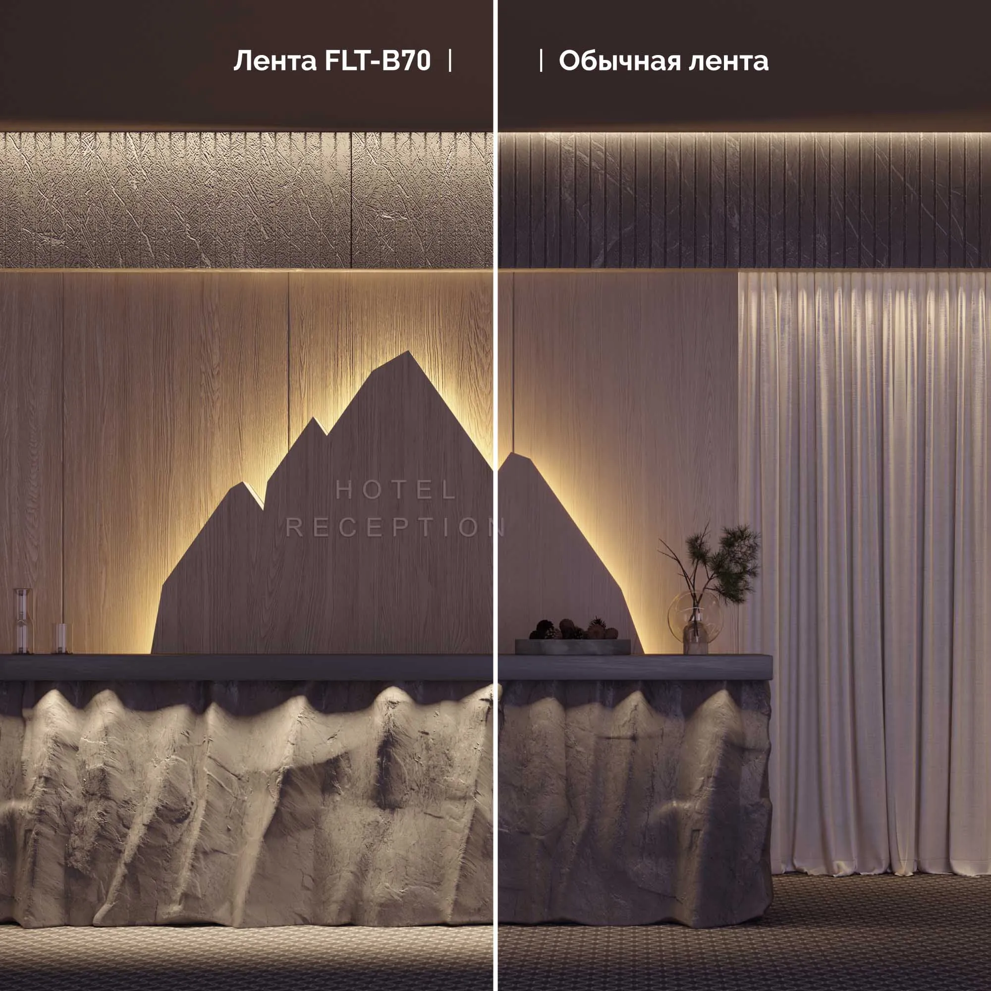 Светодиодная лента FLT серии B70 с направленной линзой 45°. Светодиоды SMD 5060, 70 шт/м. Белая плата шириной 8 мм, скотч 3M. Цвет ТЕПЛЫЙ 3000K, индекс цветопередачи CRI>90. Питание 24 В, мощность 15.5 Вт/м (77.5 на 5 м). Размеры 5000x8x6 мм. Мин. отрезок 100 мм, 7 светодиодов. Цена за 1 м