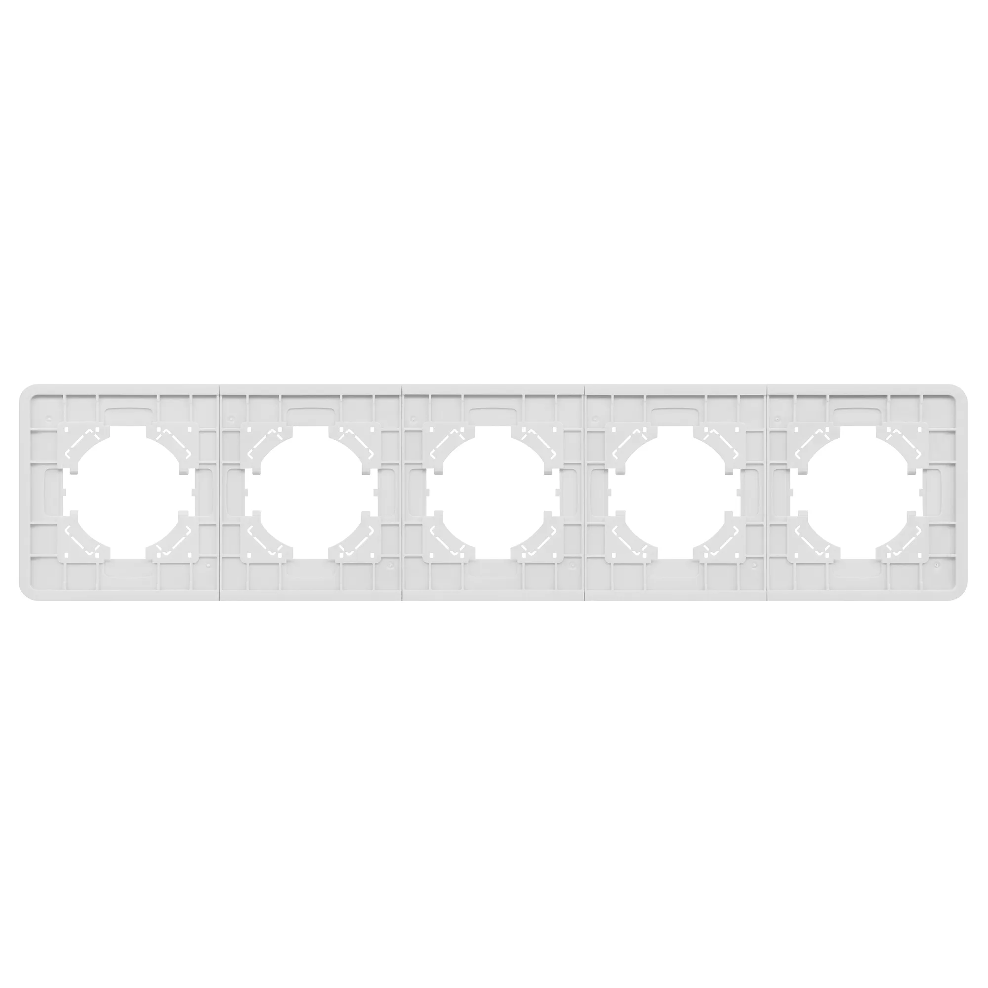 Рамка алюминиевая на 5 постов, под встраиваемый механизм. Цвет - серебристый. Уровень герметичности IP20. Ориентация монтажа - горизонтальная (основным ориентиром служат посадочные выступы для накладки механизма).