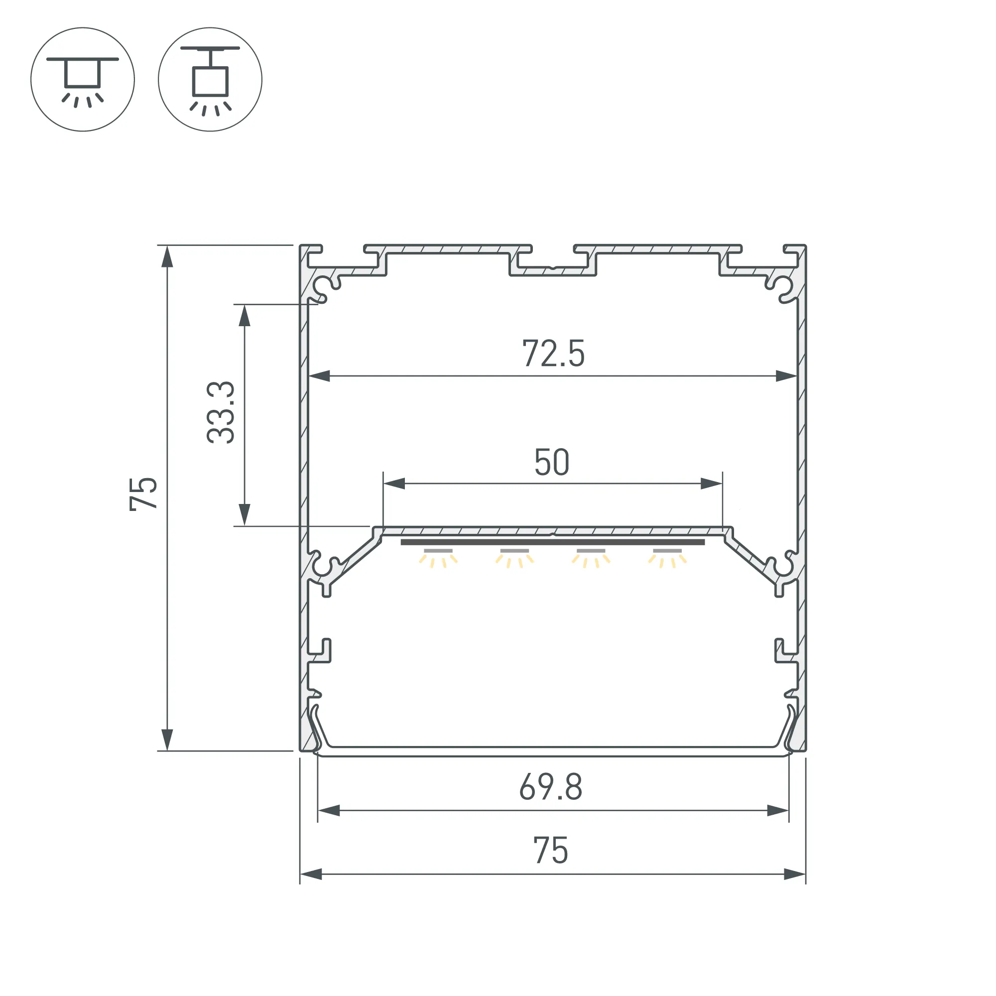 Алюминиевый анодированный профиль для светодиодных лент и линеек. Габаритные размеры (L×W×H): 3000x75x75 мм. Ширина площадки для ленты 50 мм. Отсек для БП 72,5х33,3 мм. Экраны, заглушки и другие аксессуары приобретаются отдельно. Цена за 1 метр.