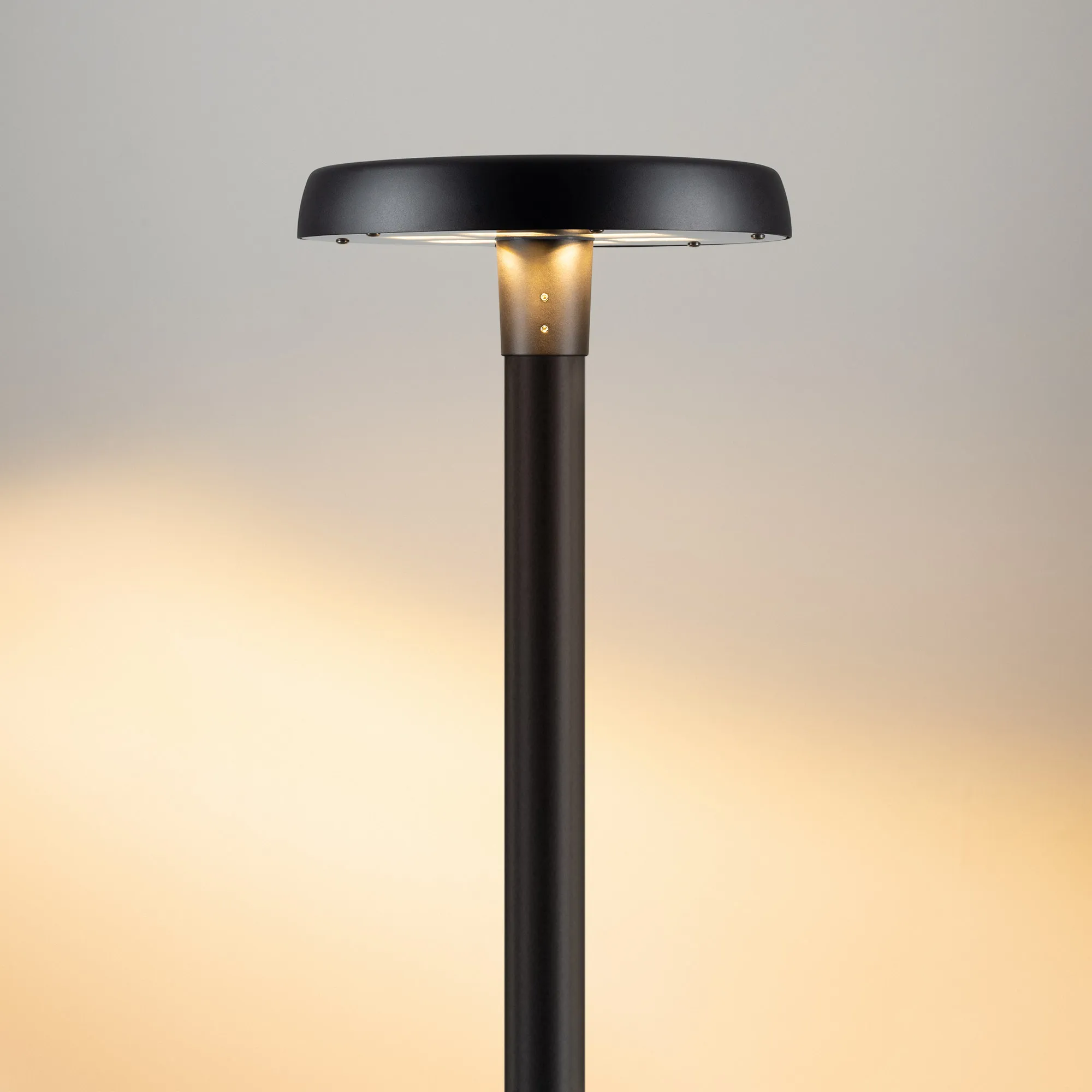 Венчающий светодиодный светильник. Мощность 50 Вт, св. поток 5680 лм, 112 лм/Вт, тёплый 2700 K, CRI>80, угол 140°, напряжение питания 230 В. Черный корпус из алюминия, экран закаленное стекло, степень защиты IP65. Размер: диаметр 510 мм, высота 200 мм. Монтаж на вертикальную опору диаметром 76 мм.