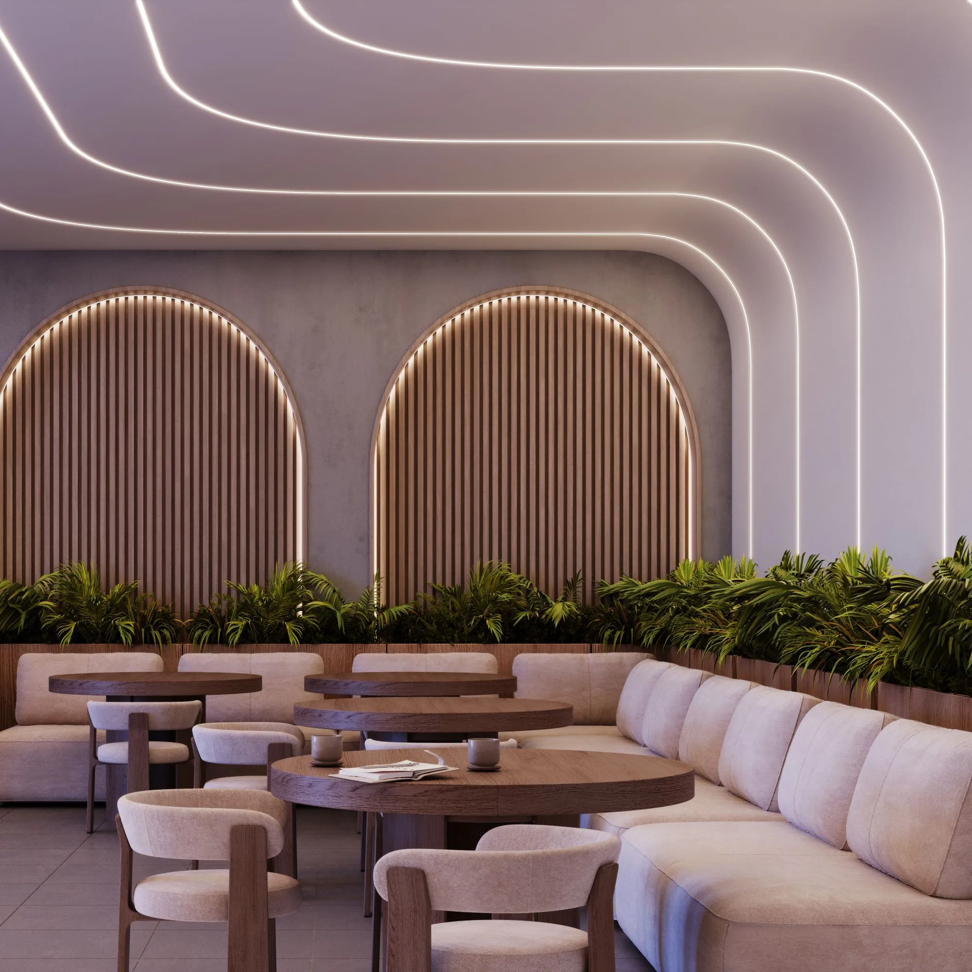 Цельнолитой силиконовый гибкий профиль, белый матовый. Габаритные размеры 10000×16×16 мм. Вертикальный изгиб TOP, минимальный радиус изгиба 50 мм. Горизонтальный изгиб SIDE, минимальный радиус изгиба 200 мм. Для установки во влажных помещениях необходима герметизация при помощи двухкомпонентного эпоксидного герметика. Класс пылевлагозащиты – IP65 (при соблюдении технологии герметизации). Для лент шириной 10 мм, высотой до 2,8 мм и мощностью до 10 Вт/м. При подборе ленты необходимо учитывать, что втяжка лент COB, герметичных лент и лент с наличием силиконового слоя может быть затруднена. Угол излучения 115°. Поставляется в катушках по 5 м. Цена за 1 м.